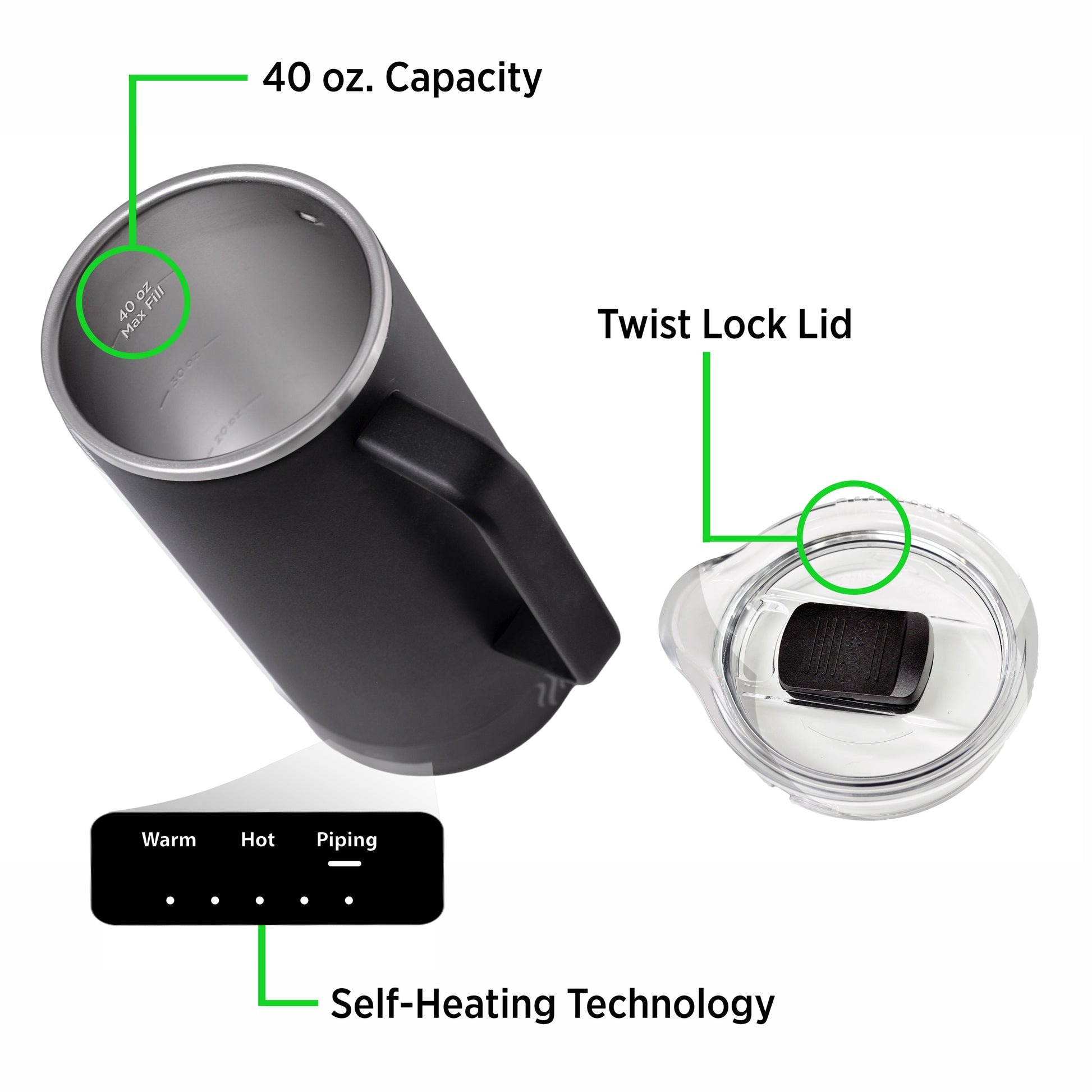 Holds 40 oz. Twist lock, easy-to-pour lid makes sure the hot beverage inside is kept safe. Ergonomic design ensures an easy pour every time.