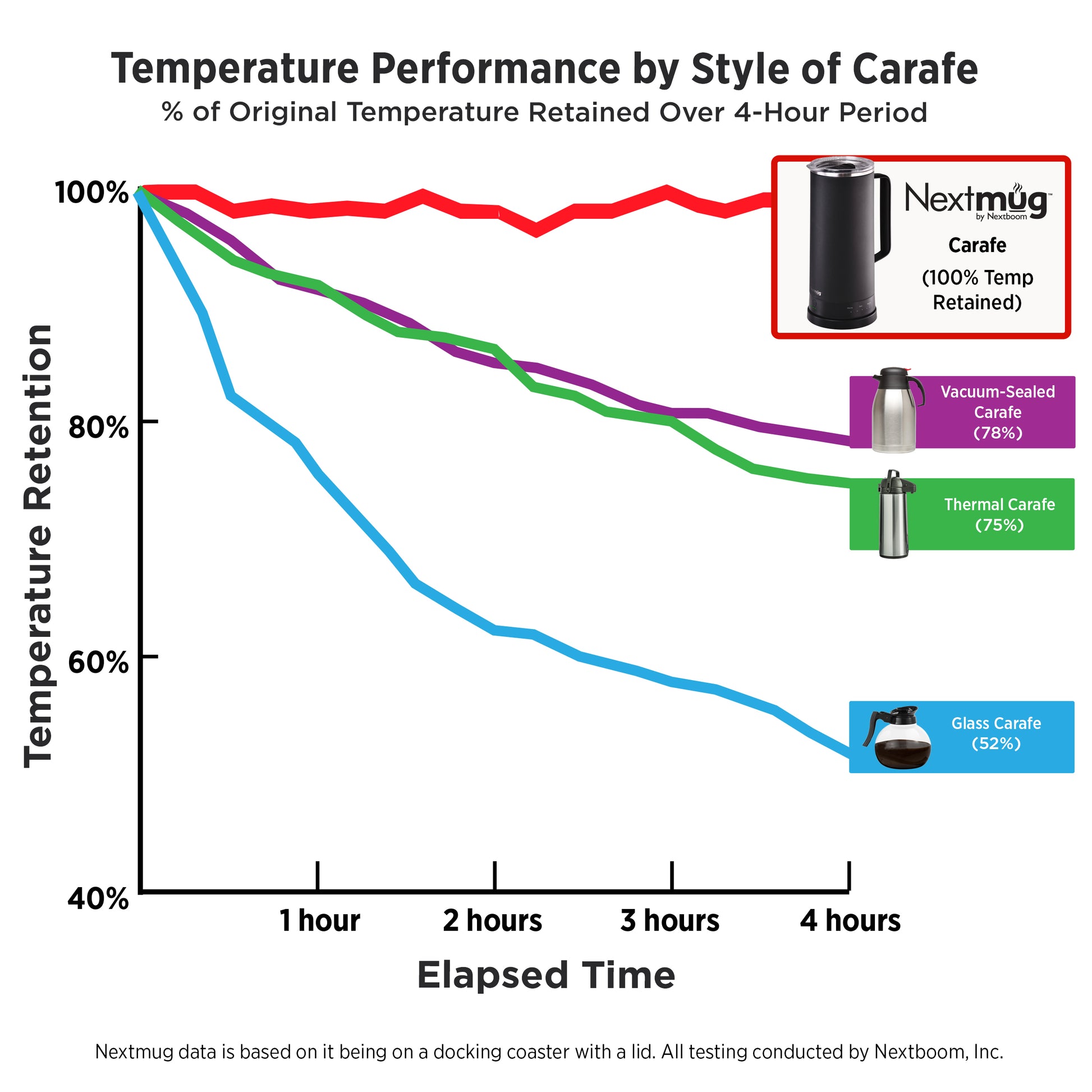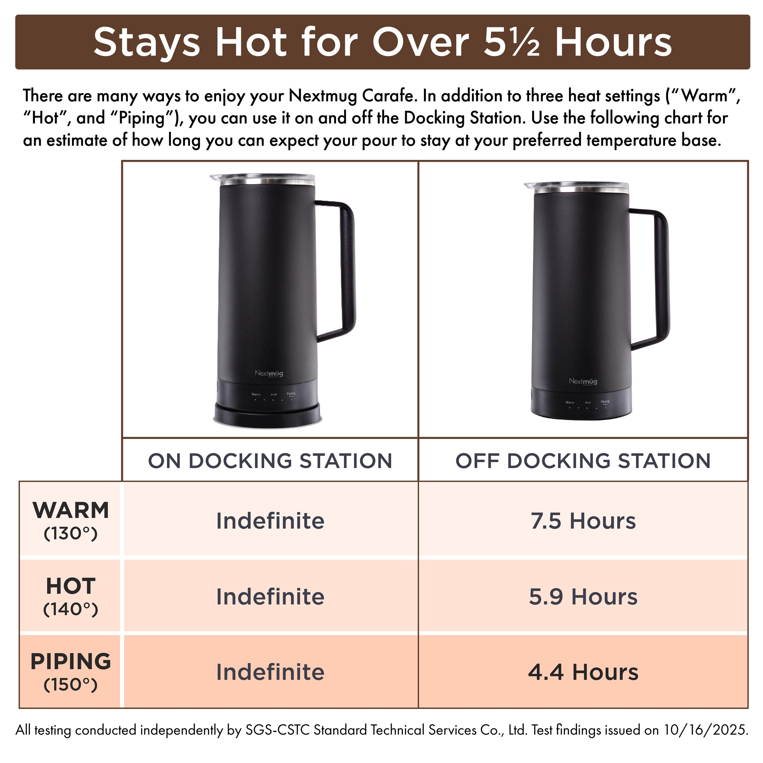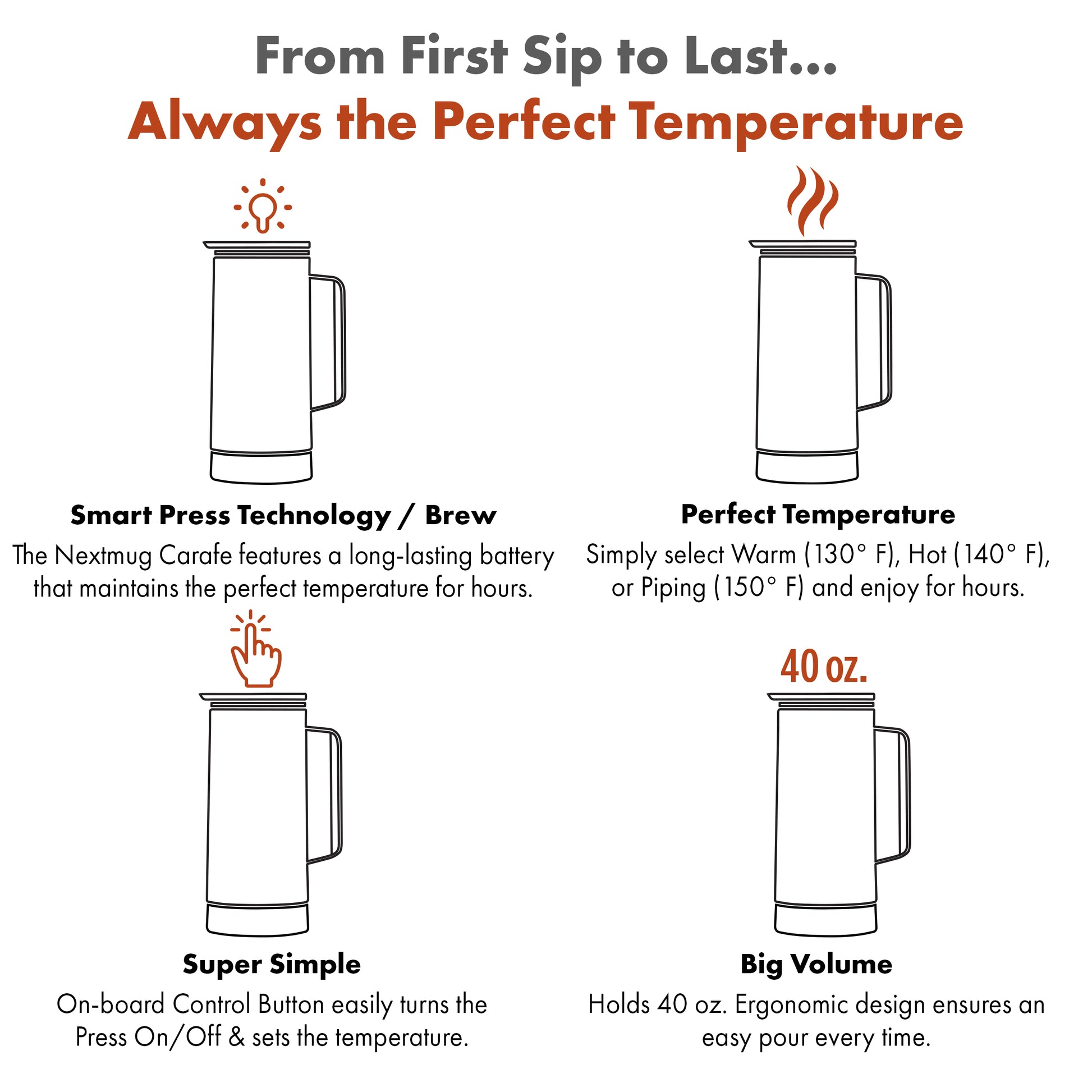 The Nextmug Carafe will hold your hot beverage at its temperature for hours. Simply select Warm (130° F), Hot (140° F), or Piping (150° F) and enjoy for hours.