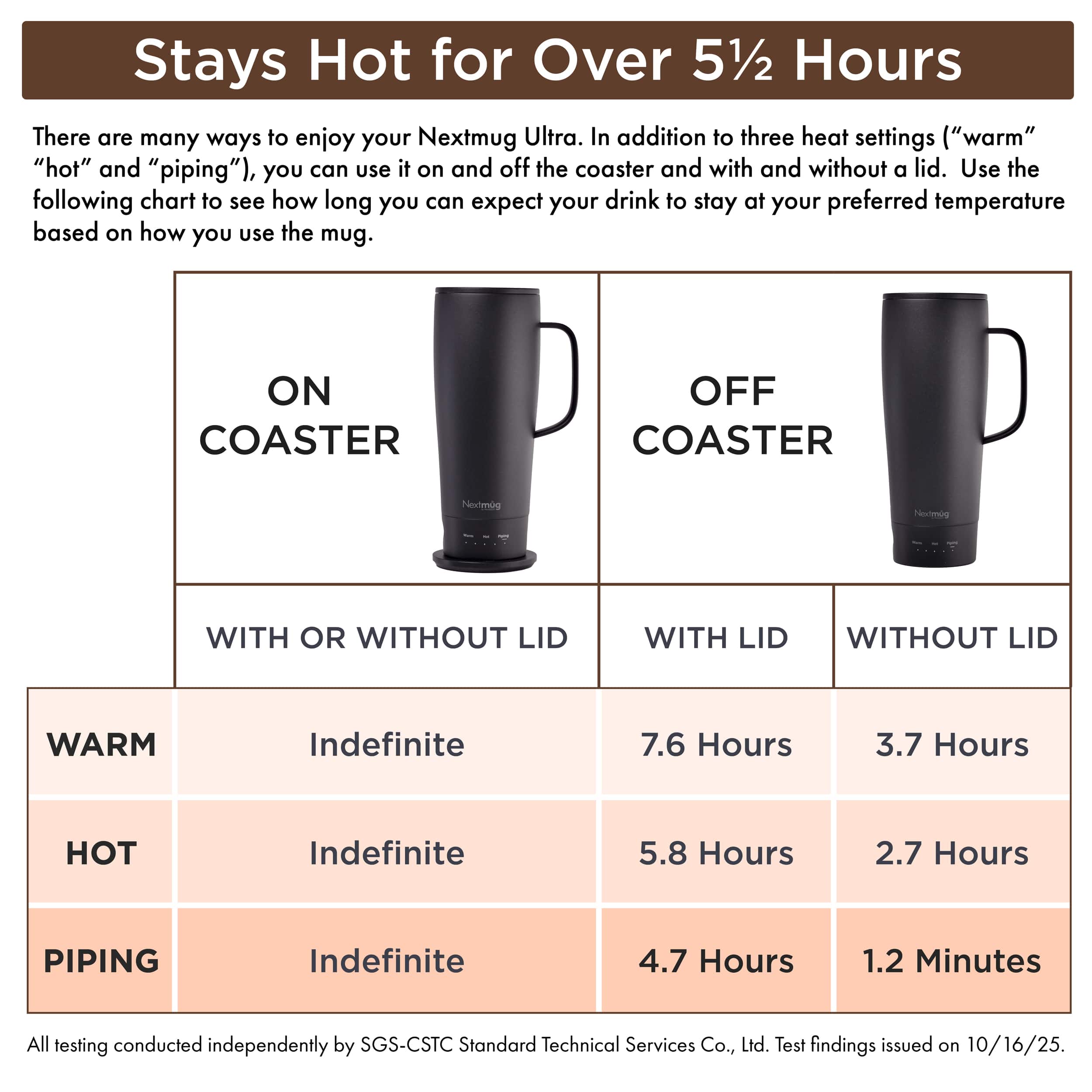 The Nextmug Ultra will keep your hot coffee, tea or preferred beverage at the perfect temperature wherever you are. Simply select Warm (130° F), Hot (140° F), or Piping (150° F) and enjoy for hours.